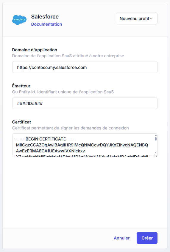 Salesforce préremplit automatiquement le formulaire SSO. Vérifiez et ajustez les champs suivants si nécessaire :